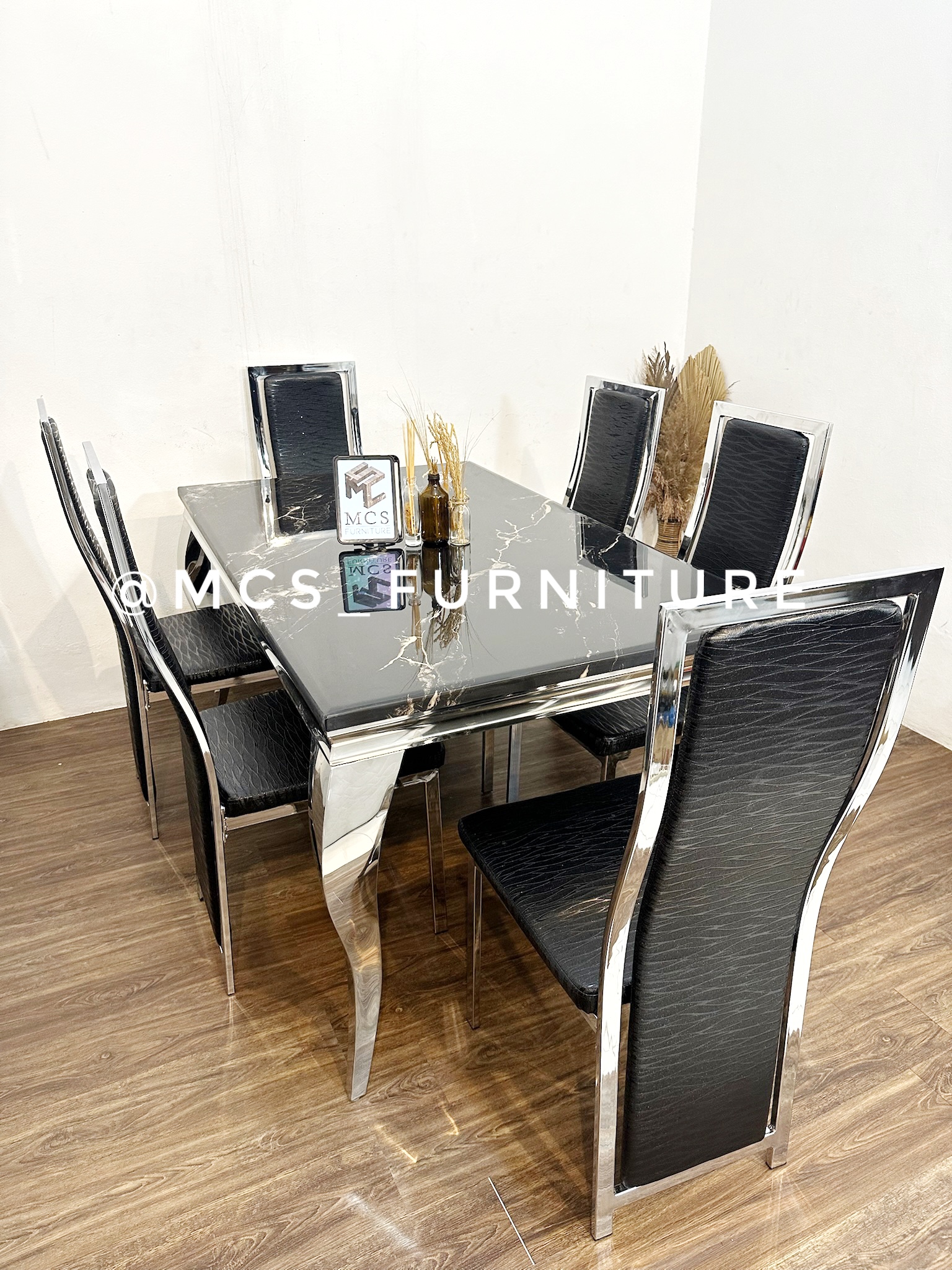 MEJA MAKAN BATU MARMER STAINLESS 6 KURSI HITAM