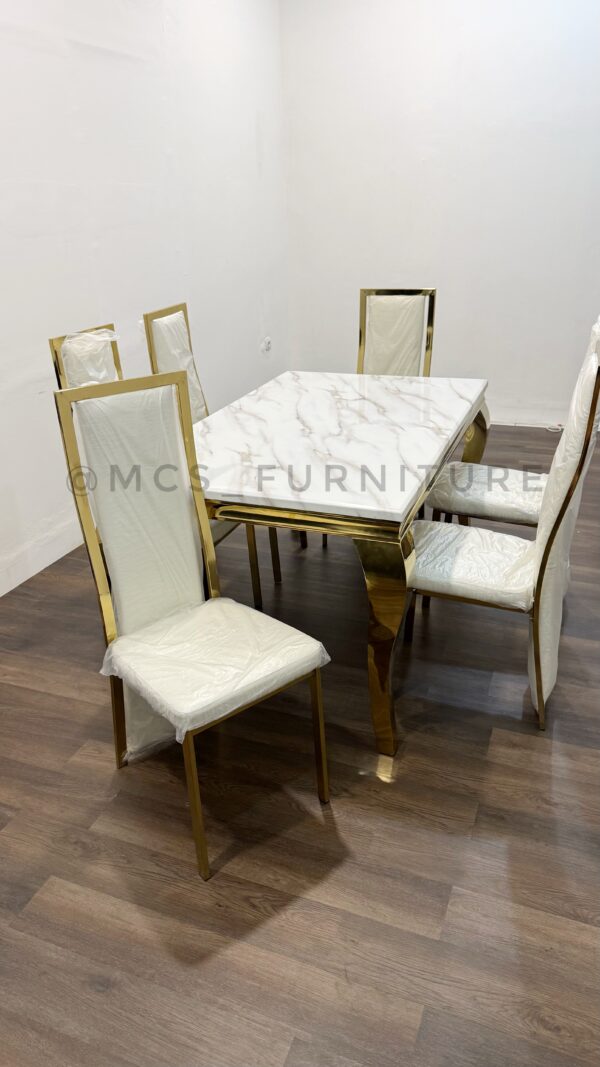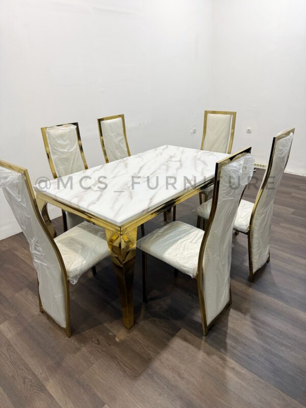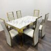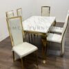 MEJA MAKAN BATU MARMER STAINLESS 6 KURSI GOLD PUTIH