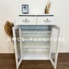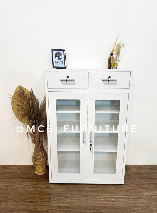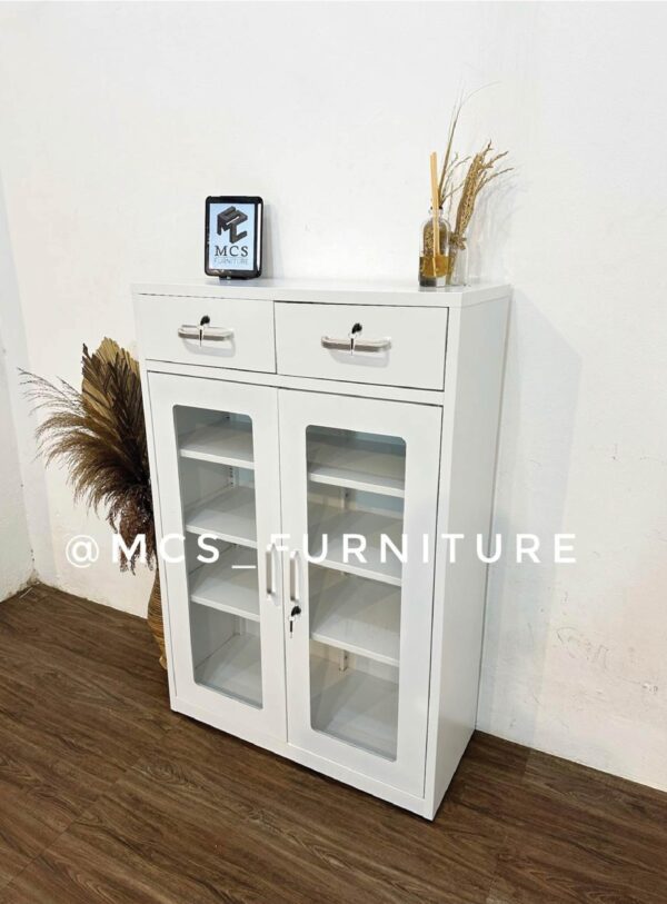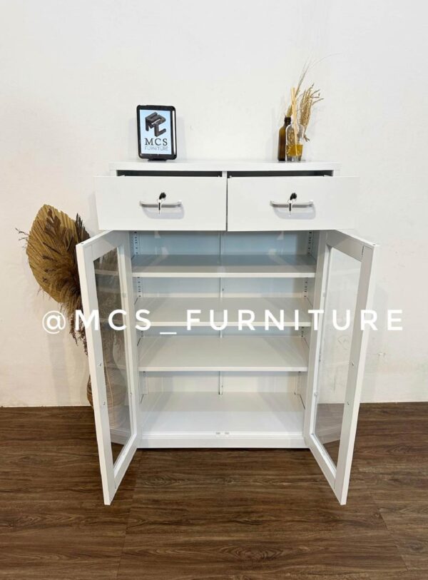 RAK SEPATU BESI SWING KACA + LACI KUNCI